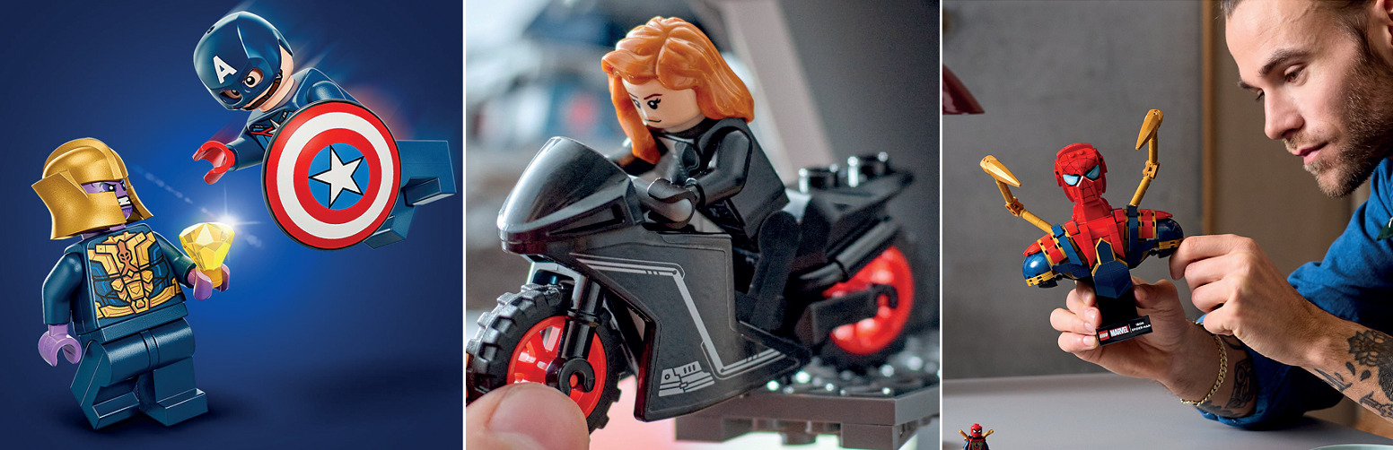 Ці набори переносять напружені битви всесвіту Marvel до світу LEGO. Космічні кораблі, бойові машини, супергерої та їхні супротивники – усе для відтворення епічних моментів із фільмів «Месники» та «Залізна людина». Набори сприяють сюжетній грі, взаємодії мініфігурок і розширенню вигаданих світів.