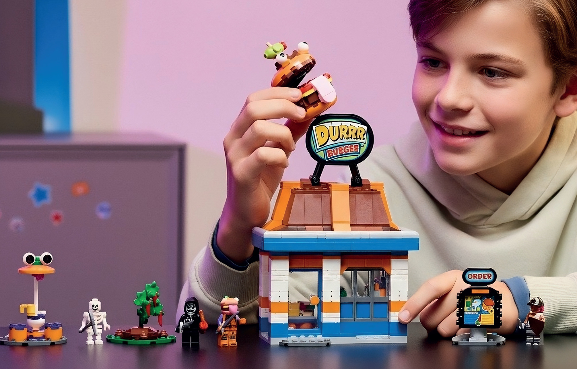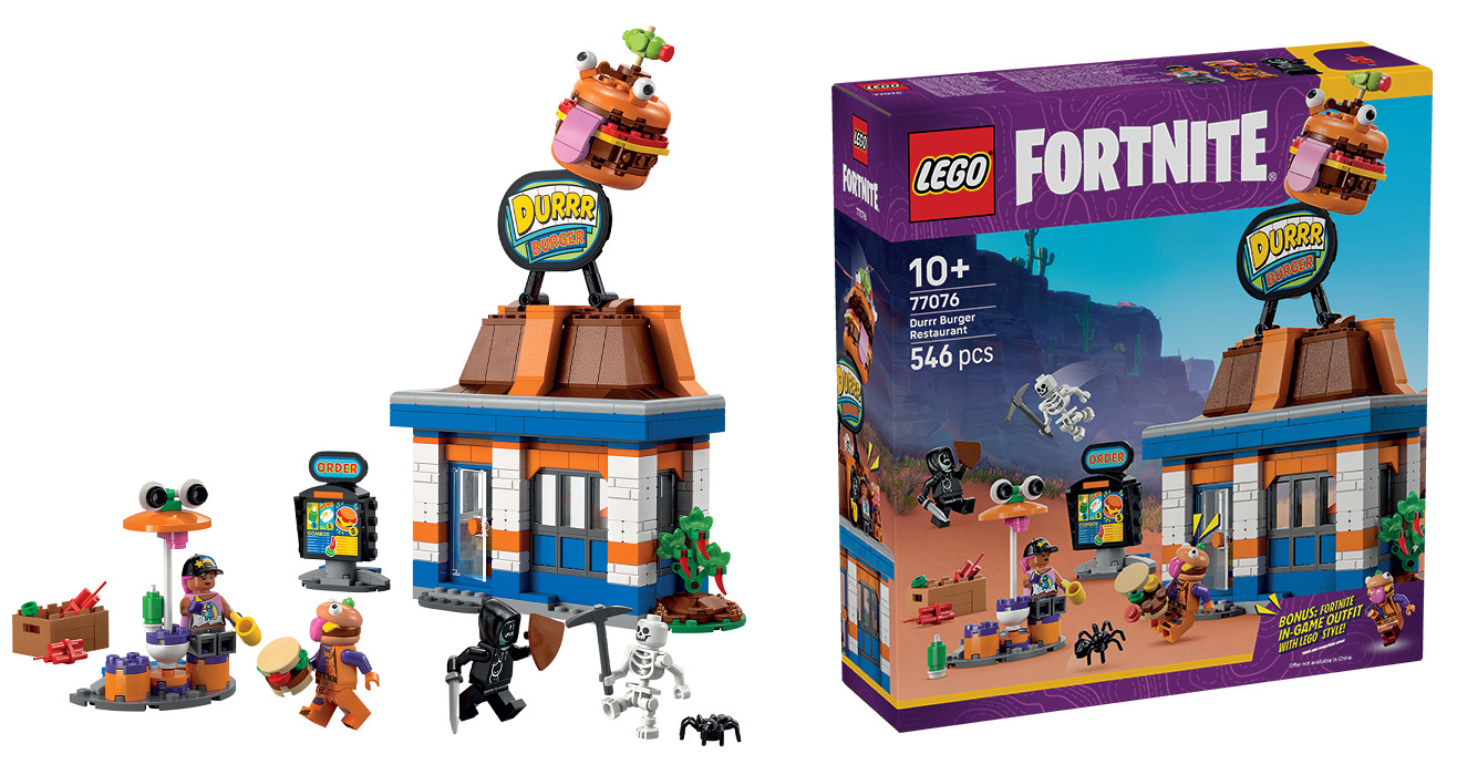 LEGO® Fortnite® 77076 Durrr Burger ресторан відтворює культову локацію з гри у форматі модульної будівлі. Набір із 546 деталей містить мініфігурки Beach Bomber, Beef Boss, Grimey і скелета для сюжетних сцен. Усередині — касовий апарат, автомат із напоями та органайзер для приправ, зовні — зона відпочинку. Горище від’єднується й містить фігурку павука та аксесуари. QR-код в інструкції відкриває бонусне вбрання Beef Boss у грі.