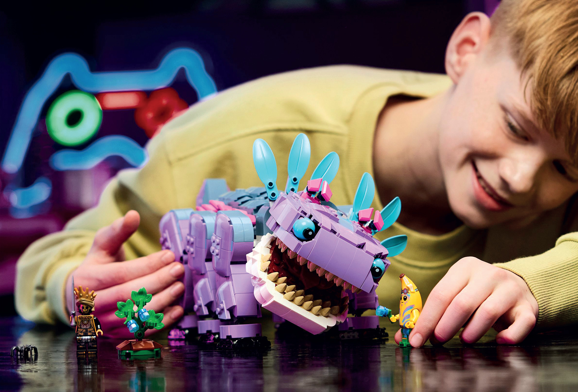 Культовий драконоподібний Klombo – один із найяскравіших персонажів Fortnite – тепер у форматі конструктора! Понад 1 000 деталей, рухливі елементи, можливість годувати Klomberries, кататися верхи