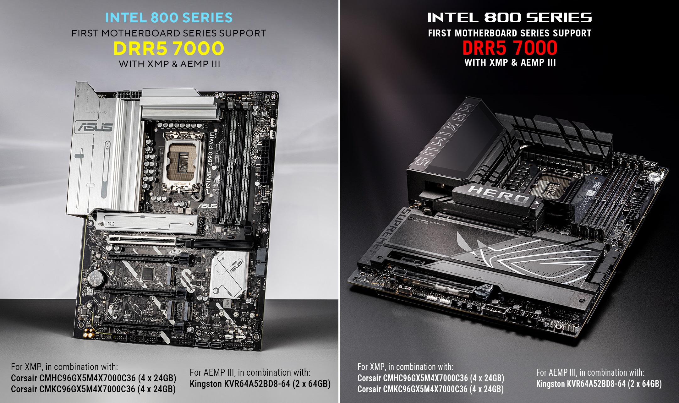 Материнські плати серії Intel 800 – ліпший вибір для ентузіастів, яким потрібна новочасна пропускна здатність і велика ємність оперативної пам’яті. ASUS першим підтримує комплекти пам’яті 4 × 24 ГБ із частотою 7 000 МТ/с у списку QVL.