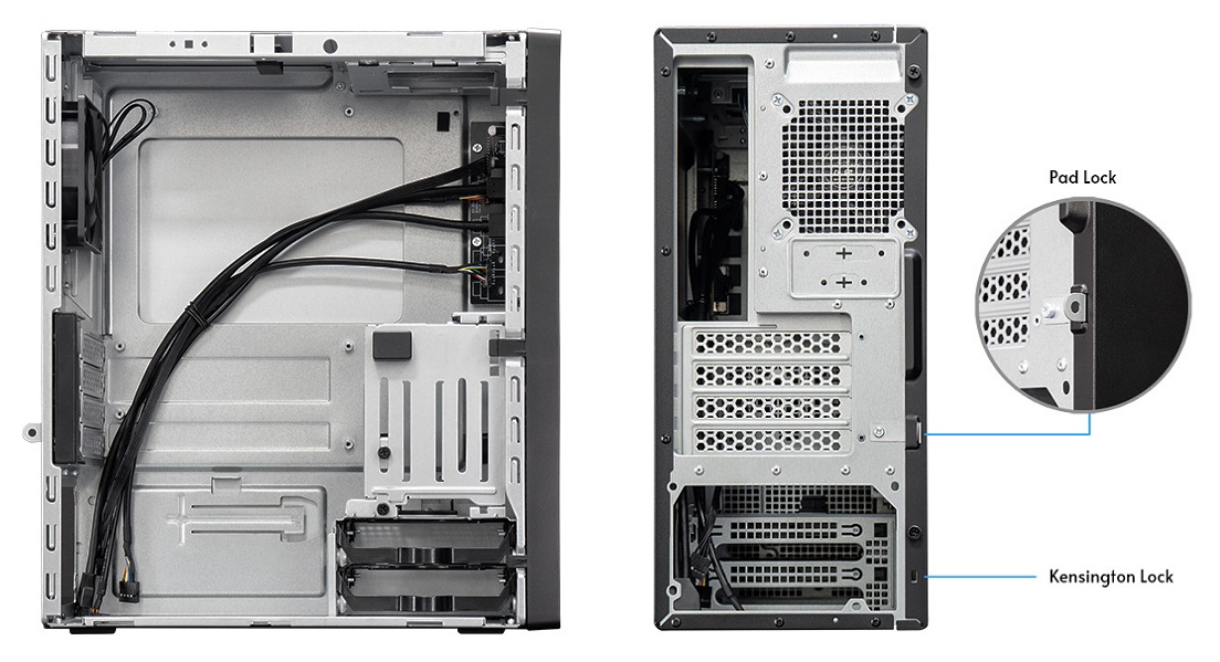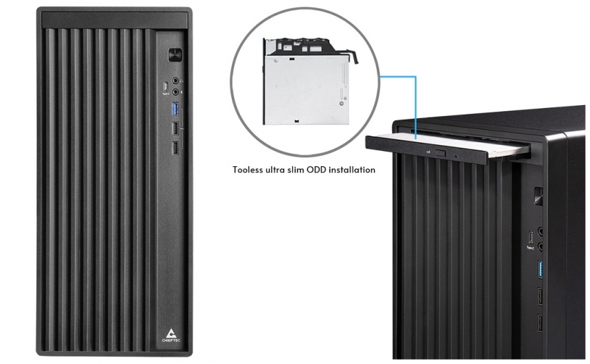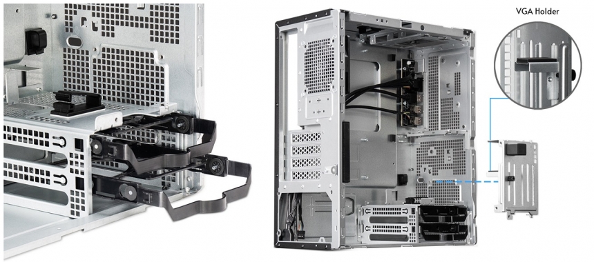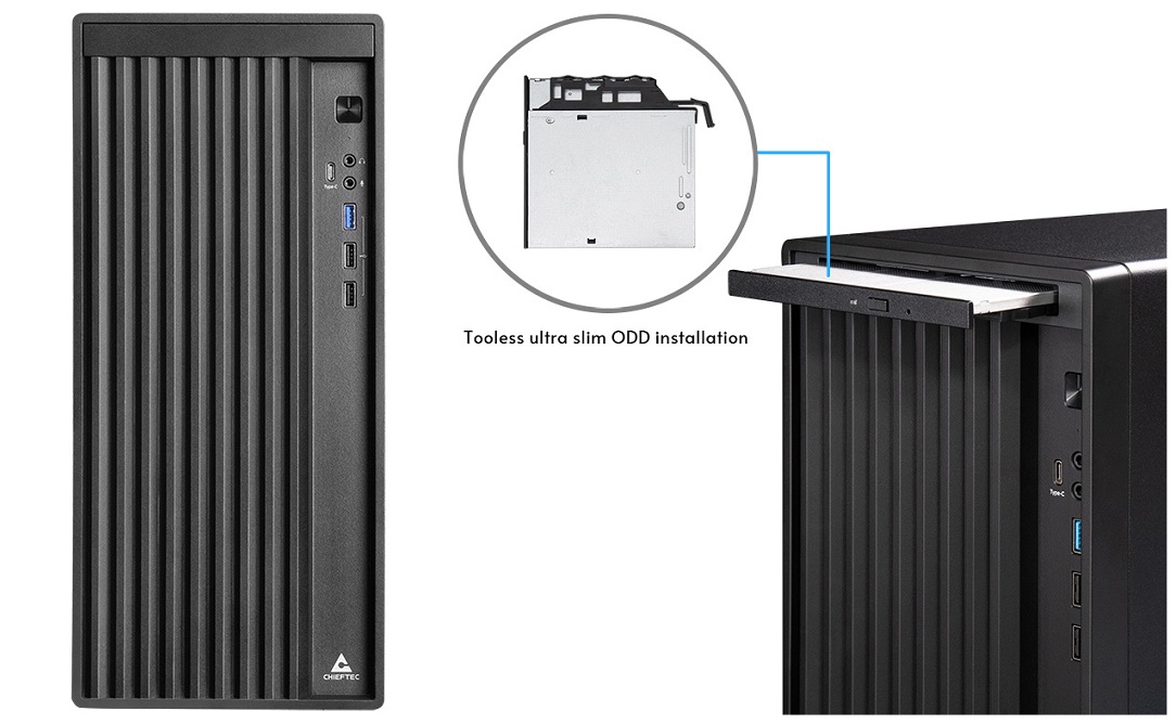 Цей корпус не поступається жодними важливими функціями, як-от: повне підтримання материнських плат формату mATX, сумісність із блоками живлення ATX, ультратонкі зовнішні диски або навіть відеокарти довжиною до 270 мм. З-поміж його численних особливостей – зручний поворотний механізм для легкого встановлення без використання інструментів.