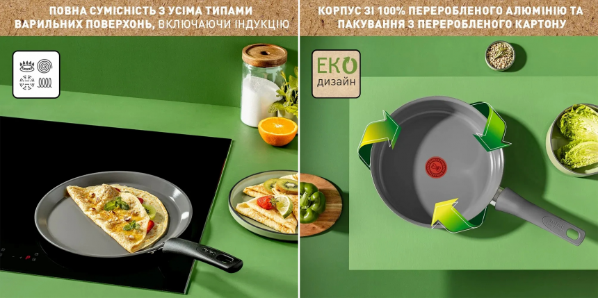 - Tefal Renewal (25 см) – стильна сковорідка з міцним протипригарним покриттям і зручним руків’ям.