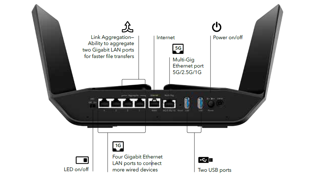 Підвищена швидкість інтернету завдяки підтриманню агрегації портів зв’язку для можливого об’єднання двох гігабітних портів або використання Multi-Gig 5G Ethernet як порту WAN (налаштовується додатково).