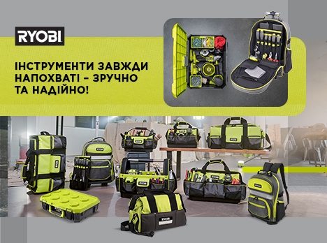 Оптимальна організація та безпечне транспортування інструментів допоможуть виконати роботу швидко та ефективно. Вибирайте рюкзаки, сумки, ящики RYOBI та забудьте про хаос у робочій зоні!