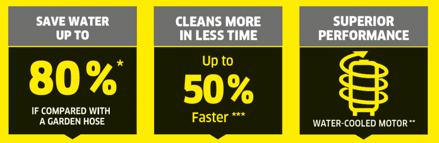 • 8 л на хвилину – витрата води мінімийкою Kärcher, як порівняти з 20 л на хвилину звичайного садового шланга.
