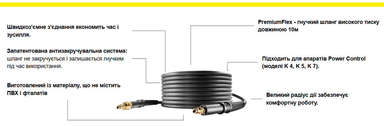 Моделі мінімийок Kärcher K 4, K 5, K 7 серії Power Control Flex обладнано революційним шлангом PremiumFlex, який забезпечить: