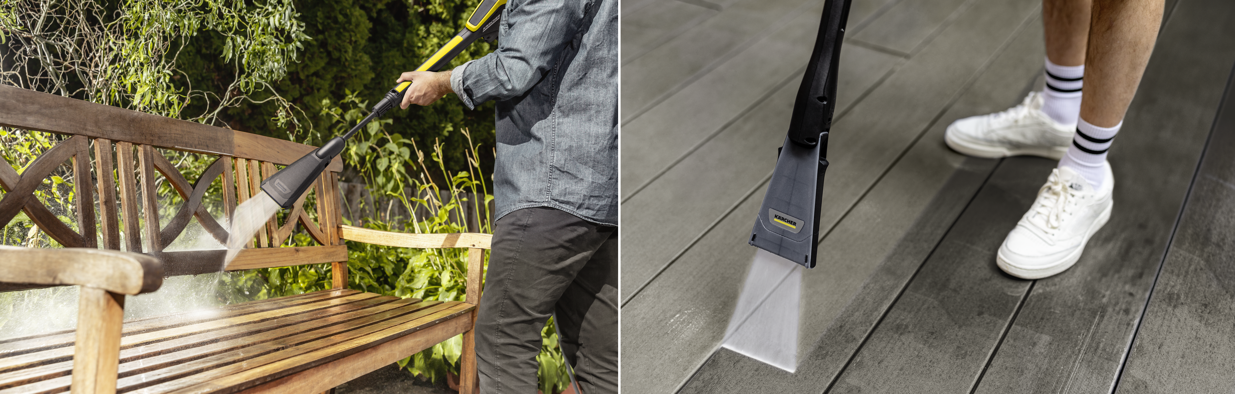 • Для очищення садового стільця мінімийка Kärcher витрачає близько 20 л води за 2,5 хв, тоді як шланг – 100 л за 5 хв.