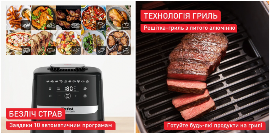 Мультифункціональність: 10 попередньо встановлених програм дають змогу готувати різноманітні страви, як-то картопля фрі, нагетси, бекон, креветки, курка гриль, піца, стейк, овочі, риба та випічка.