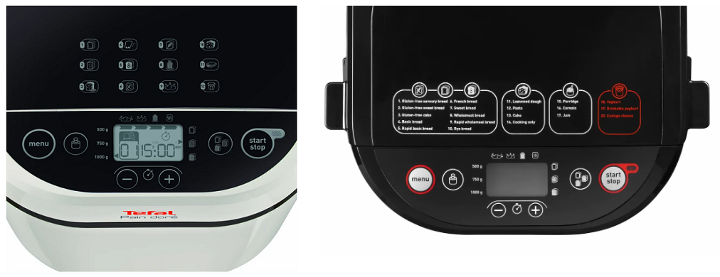 Хлібопічки Tefal доступні в різній комплектації та з різною кількістю програм (17–20). Із пристроєм можна приготувати: