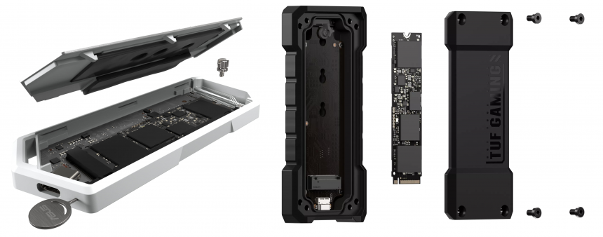 Контейнер для NVMe-накопичувачів ROG Strix Arion (ESD-S1C): інтерфейс USB 3.2 Gen2 Type-C (10 Гбіт/с), два кабелі (USB-C -> C та USB-C -> A), встановлення накопичувача без інструментів , термопрокладки в комплекті, сумісність з PCIe-пристроями форм-факторів 2280/2260/2242/2230 (ключ M або B+M). Інтерфейс USB-C 3.2 Gen2 зі швидкістю передачі до 10 Гбіт/с. Підтримка твердотільних накопичувачів M.2 (PCIe) форм-факторів 2230/2242/2260/2280. Установка без використання викрутки.