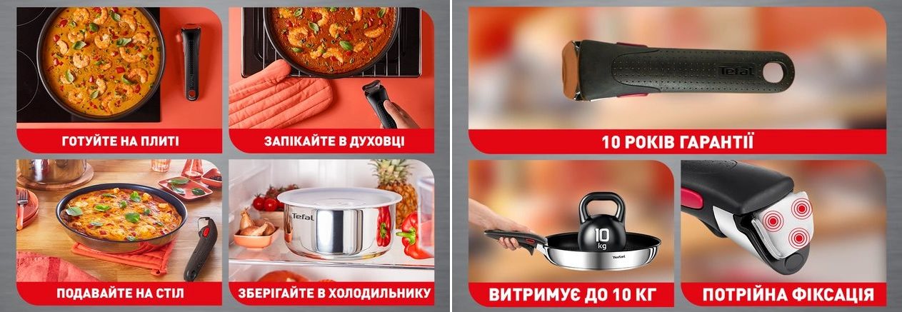 Корпус посуду виготовлено з високоякісної нержавіючої сталі, яка не лише стійка до подряпин і корозії, а й має елегантний вигляд навіть після тривалого щоденного використання. Руків’я з термостійкого бакеліту витримує вагу до 10 кг і залишається приємним на дотик. Його легко фіксувати й так само легко знімати – навіть однією рукою.