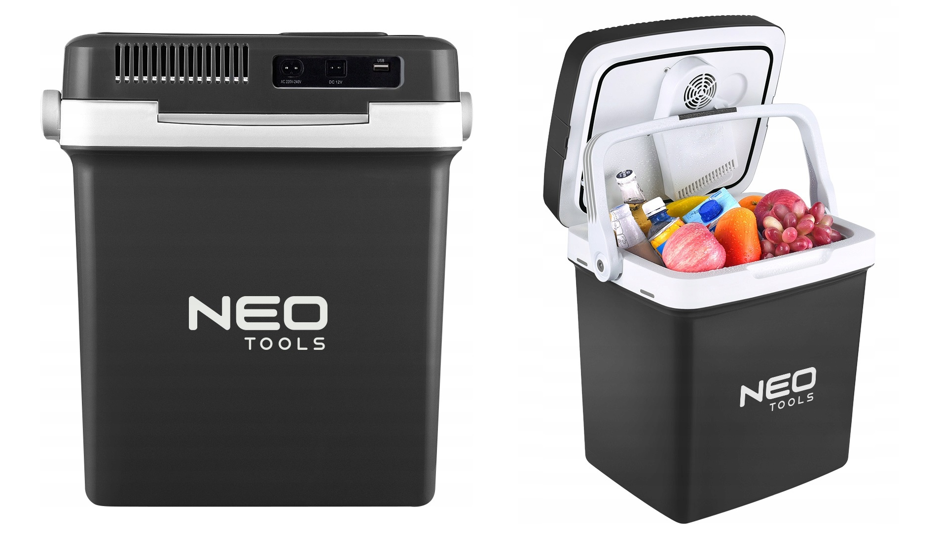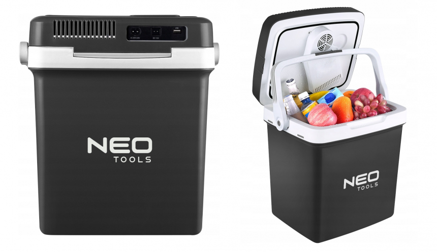 NEO Tools 63-152 – електронний холодильник-обігрівач ємністю 26 л, вагою 3,8 кг, із можливістю охолодження до -9 °C і нагрівання до +65 °C. Споживання потужності не перевищує 60 Вт, що дає змогу ефективно використовувати пристрій у подорожах. Електронна панель керування, USB-порт, система екорежиму, можливість роботи як від мережі 230 В, так і від автомобіля (12 В) – ключові елементи, які додають зручності.