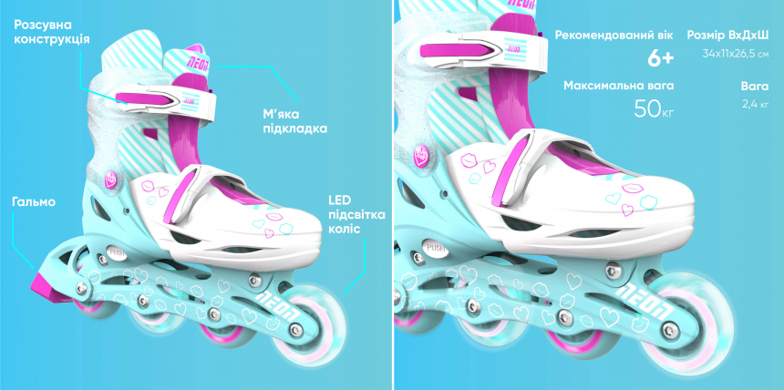Конструкцію Neon Inline Skates розроблено з урахуванням анатомії дитячої стопи. Особливу увагу приділено безпеці маленьких ролерів.