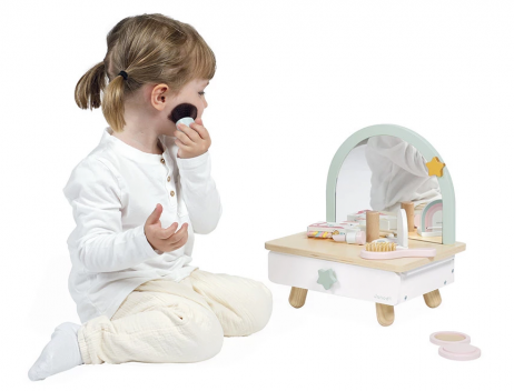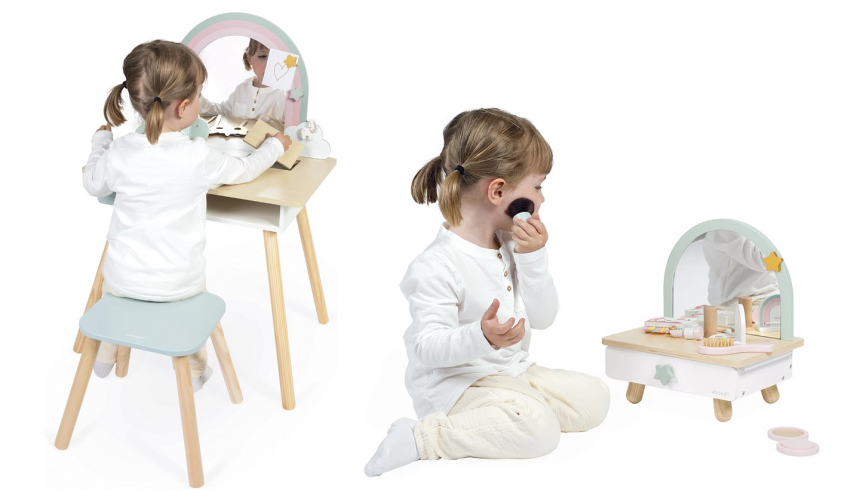 Маленький дерев'яний туалетний столик, який ідеально підходить для дітей віком від 3 років, є чудовою імітаційною іграшкою, яку можна подарувати шанувальниці єдиноріжок! У комплекті з 7 аксесуарами ви зможете імітувати дорослих, готуючись перед дзеркалом, або побалувати улюблених м'яких тварин і ляльок, граючи в учня перукаря.