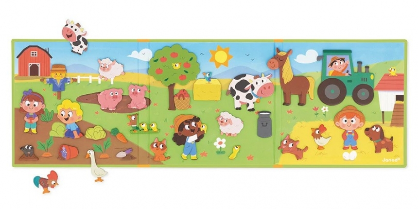 Ку-ка-ре-ку! Закликаємо всіх початківців фермерів! Діти віком від 3 років запрошуються на ферму з ілюстрованим магнітним фоном, який поєднує врожай із поросятами. Ця магнітна гра складається з магнітного фону та 30 магнітів.