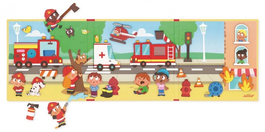 Маленька кішка, яку потрібно врятувати, вогонь, який потрібно загасити, і дитяче бу-бу, про яке потрібно піклуватися. На щастя, пожежники тут, щоб впоратися з ситуацією! Ця магнітна гра порадує дітей віком від 3 років, коли вони візьмуть на себе роль пожежників.