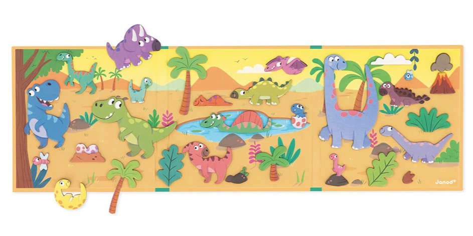 Тварини юрського періоду знаходяться в межах легкої досяжності! Магнітна гра відкриває двері в далеку епоху, населену динозаврами, для дітей віком від 3 років. Вона складається з ілюстрованого фону та 30 магнітів на тему динозаврів.