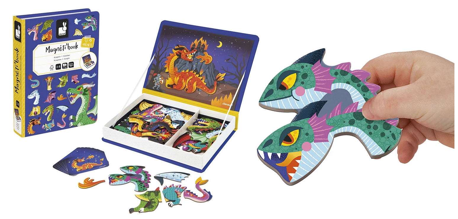 Поступіться місцем знаменитим вогнедихаючим створінням! Ця магнітна розвиваюча гра порадує шанувальників драконів віком від 3 років. Стимуляція уяви є ключовим етапом у розвитку дитини: за допомогою цієї книги Magneti'book ваш малюк буде схильний уявляти незліченну кількість історій та істот. Вони можуть або звертатися до моделей і барвистих ілюстрацій, або уявляти власні історії від А до Я, змішуючи магніти.