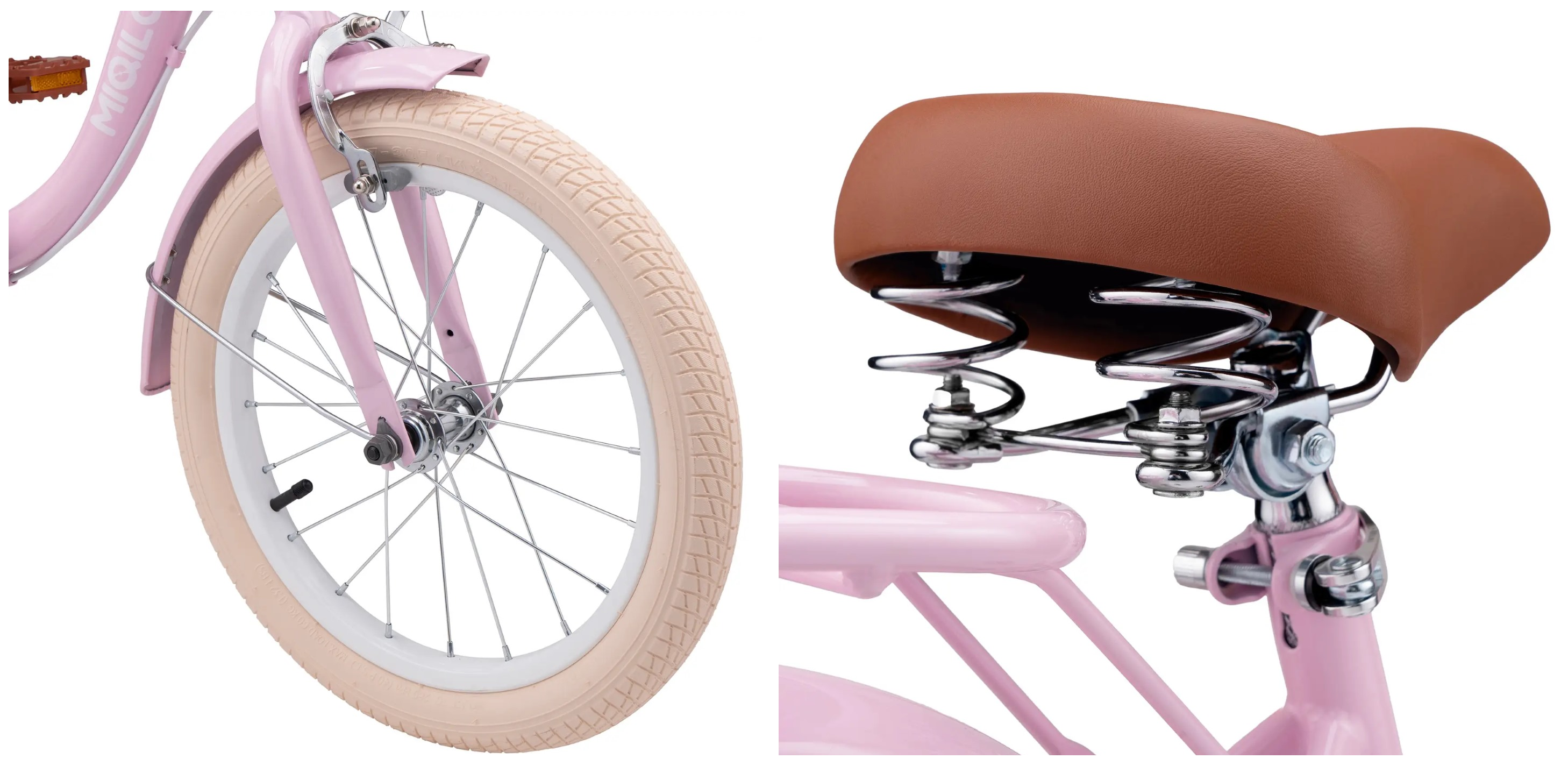 Велосипед для дітей Miqilong LS 16 - це втілення сучасного уявлення про ретро дизайн. Використання фарбування у стилі 50-х років ХХ століття та корзинки ручної роботи з натурального ротангу роблять дизайн велосипеда вишуканим та елегантним.
