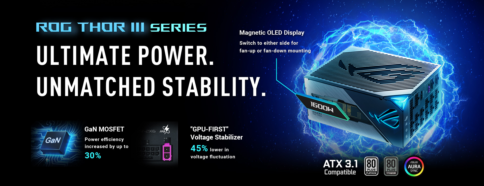 Топові блоки живлення ASUS також оснащено новим запатентованим інтелектуальним стабілізатором напруги GPU-First (IVS). Це підвищує стабільність напруги на 45 %, навіть під час вимогливих ігрових сесій і розгону. Контролюючи потреби відеокарти щодо напруги, блоки живлення ROG Thor III і ROG Strix Platinum швидше адаптують енергоживлення, забезпечуючи оптимальну продуктивність ПК.