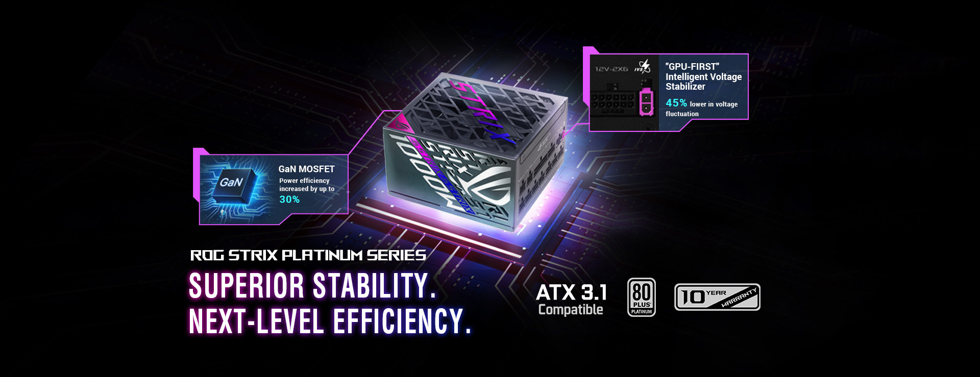 Незалежно від того, який блок живлення виберете, можна не сумніватися – із комплектованням ASUS і ROG гарантовано надійне та стабільне живлення, що забезпечує тривалу й безперебійну роботу ПК.