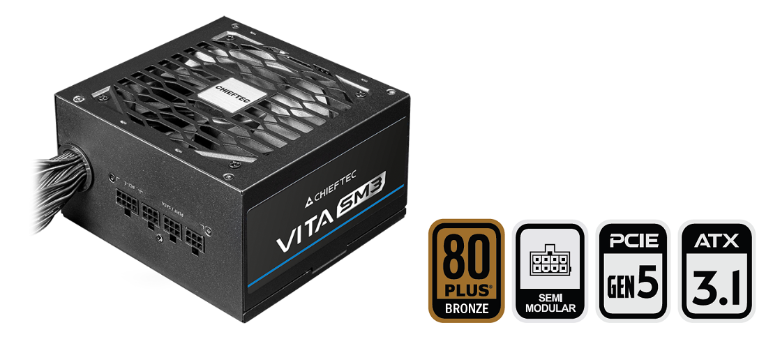 Блоки серії CHIEFTEC VITA SM3 підтримують стандарти Intel ATX 3.1 та PCIe GEN 5, а також забезпечують енергоефективність, сертифіковану за 80 PLUS Bronze.