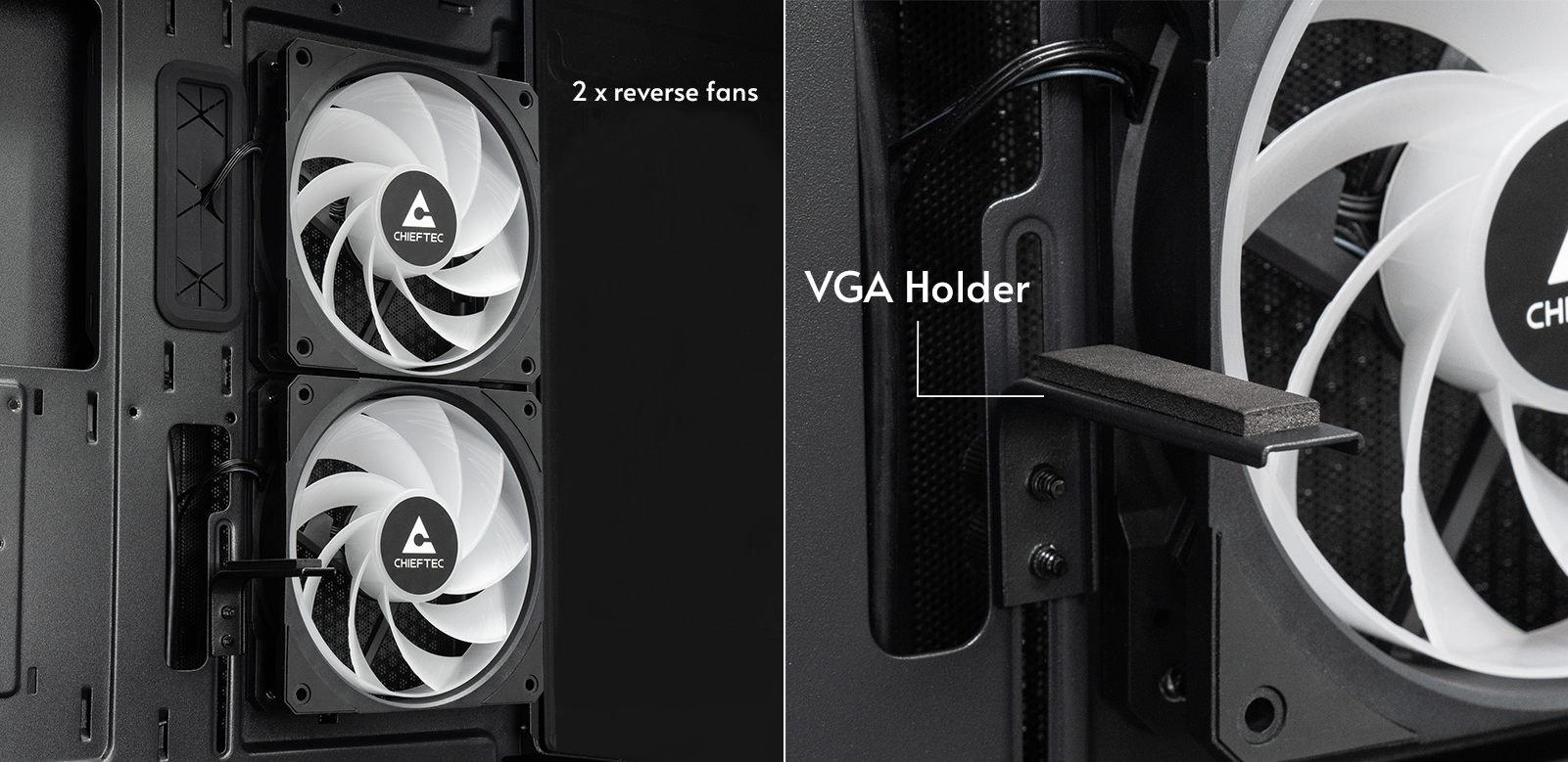 У комплекті є три попередньо встановлені вентилятори A-RGB діаметром 120 мм, а також концентратор керування, який дає змогу синхронізувати підсвічування з материнською платою та керувати швидкістю обертання вентиляторів за допомогою PWM. Два з цих вентиляторів мають лопаті з реверсивним потоком повітря, забезпечуючи оптимальний приплив повітря з боків і знизу та не порушуючи естетики. Виготовлений з урахуванням потреб геймерів, CHIEFTEC VISTA дає змогу створювати унікальні та персоналізовані конструкції.