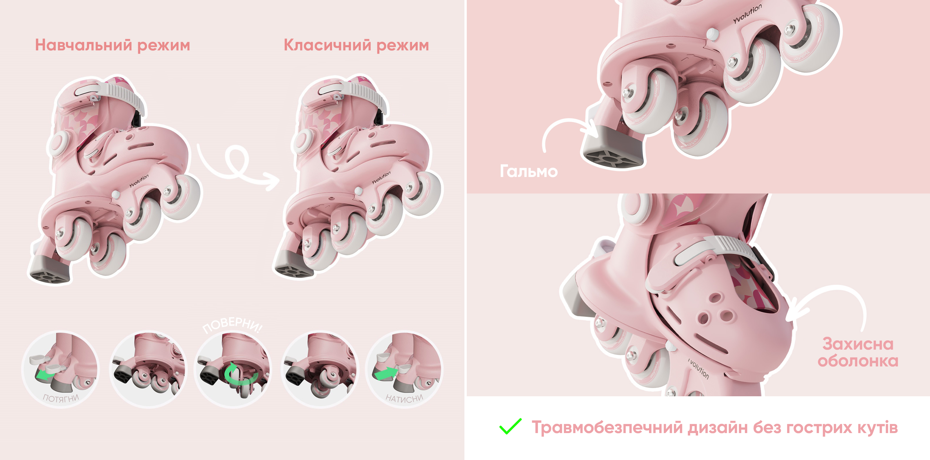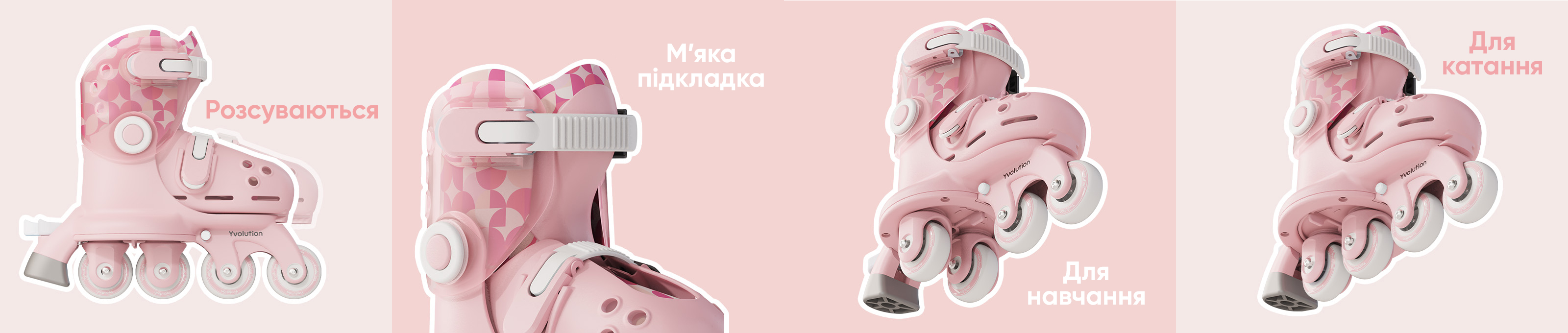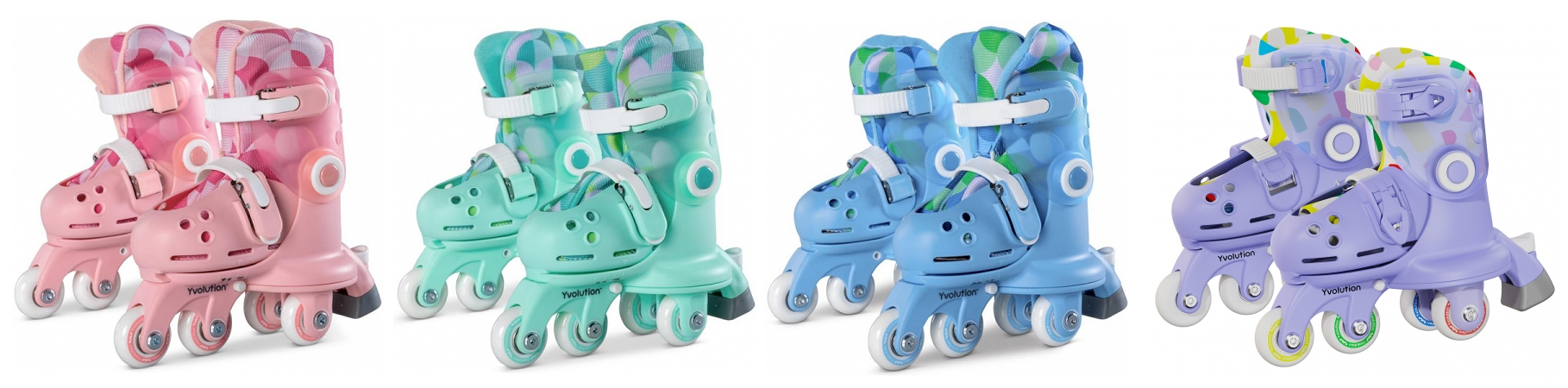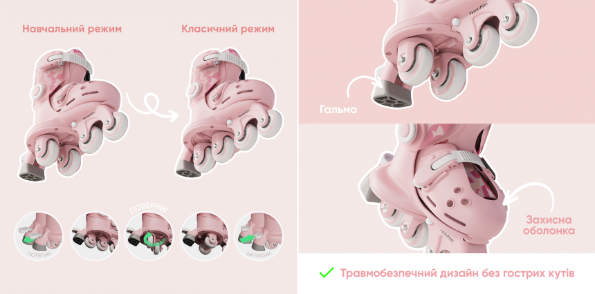 В асортименті наявні ролики в рожевому, блакитному та салатовому кольорах. У новому сезоні до лінійки додано фіолетовий колір – стильне рішення для тих, хто шукає щось яскраве й нестандартне.