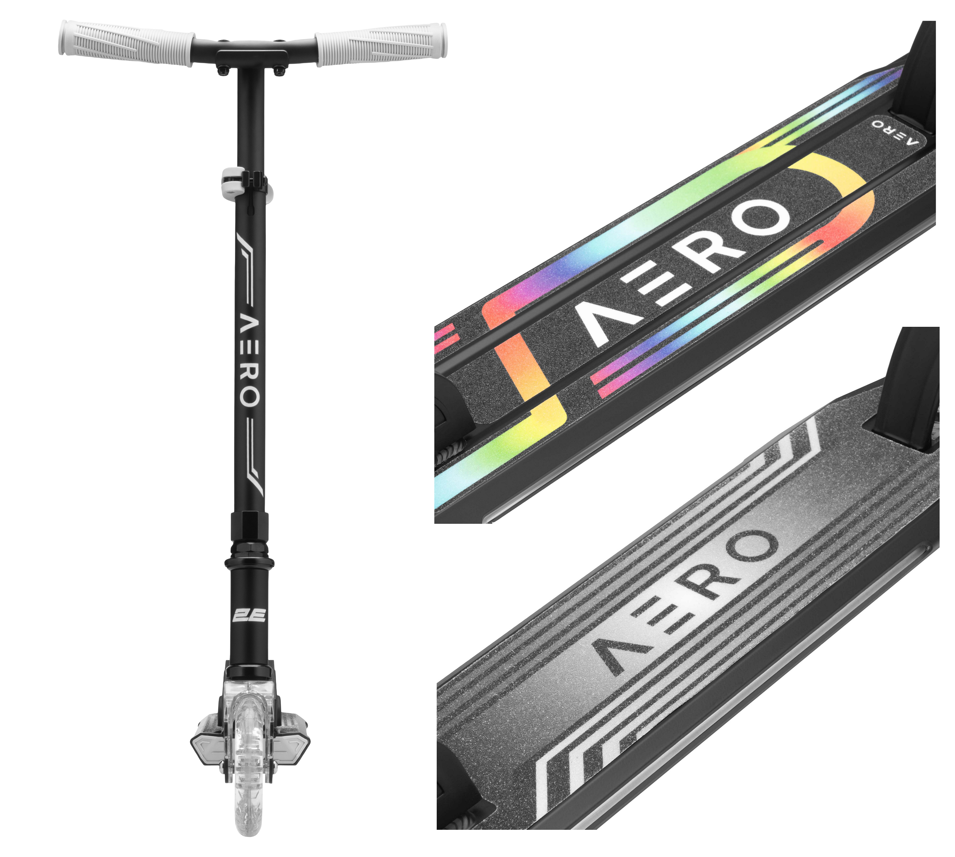 • 2E Aero MAX RGB (код товару: AERO-145-RGB) – модель дещо більшого розміру з трьома рівнями регулювання керма (77, 84 та 91 см) і розширеними габаритами. Витримує навантаження до 70 кг, тому згодиться для підлітків. Дизайн передбачає виразні акценти: логотипи на деці та кермі оформлено в райдужному стилі, що гармонійно доповнює динамічне підсвічування.