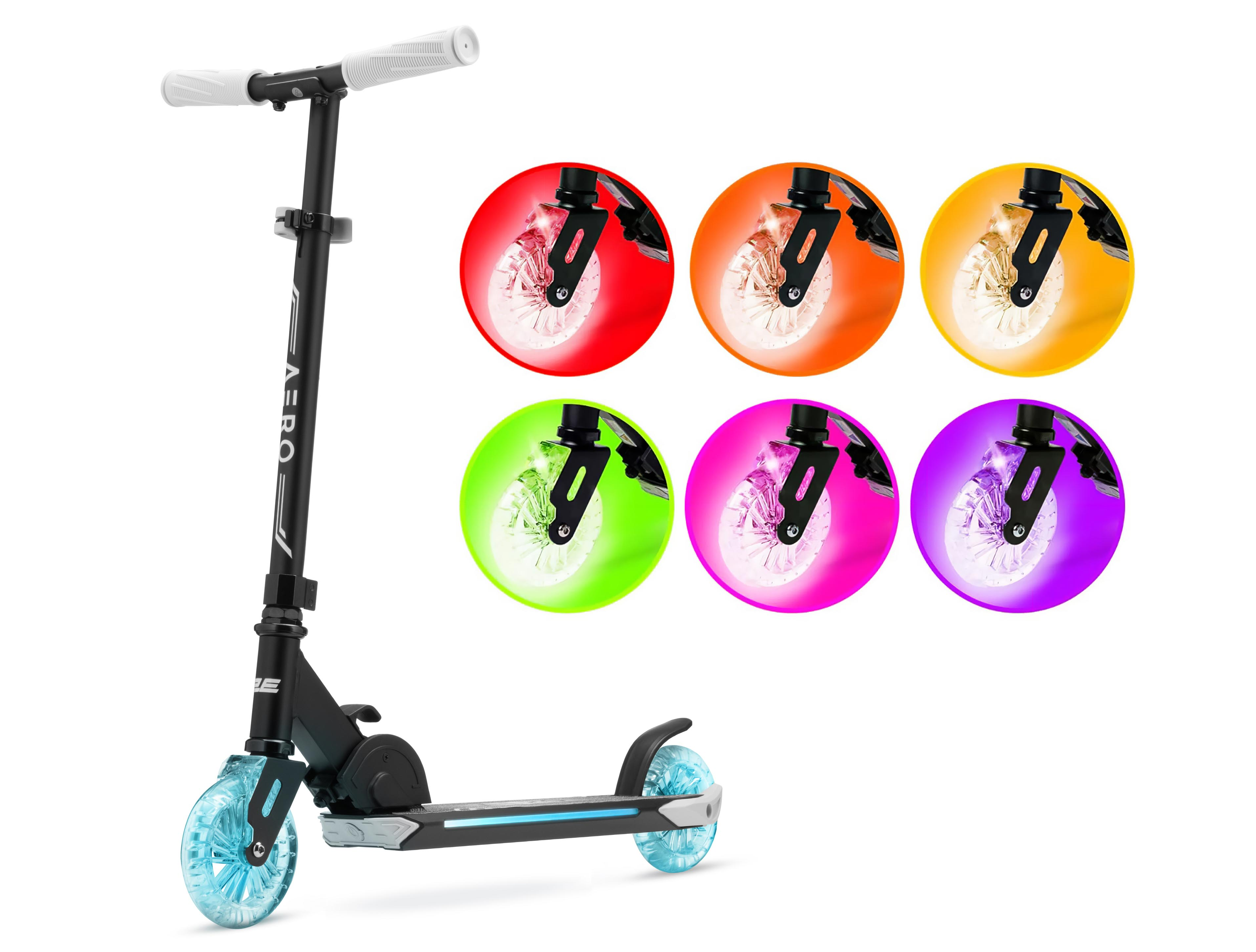 Самокат 2E Aero RGB створено для дітей віком від 5 років (із максимальним навантаженням до 50 кг). Завдяки унікальному RGB-підсвічуванню та напівпрозорим колесам діаметром 125 мм, кожна поїздка перетвориться на незабутню подію.
