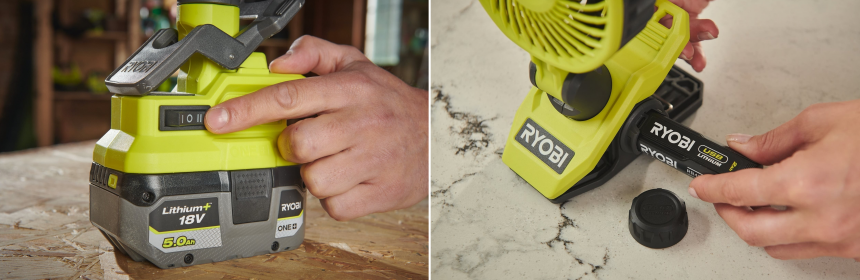 Головною перевагою вентиляторів RYOBI є робота від акумуляторів ONE+ 18В та USB Lithium 4В, сумісних з інструментами відповідної серії. Тобто один і той самий акумулятор можна використовувати для шуруповерта, лобзика, повітродувки, ліхтаря та вентилятора – це зручно й економно.