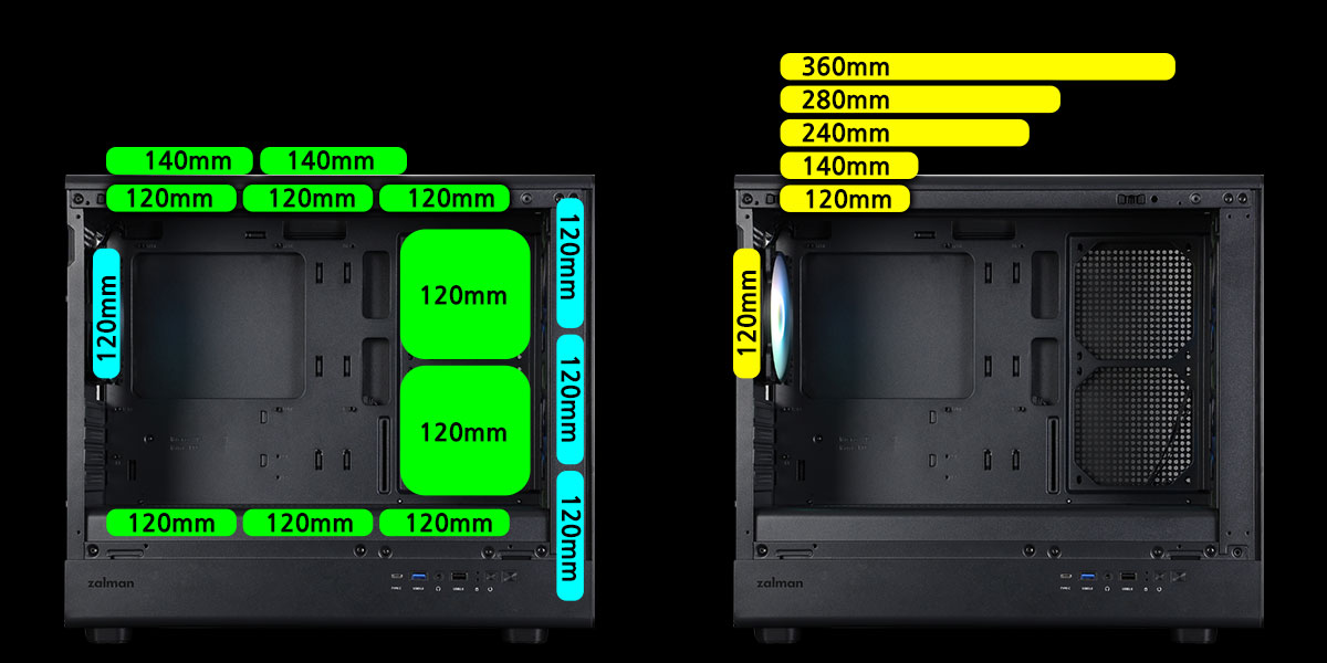 На верхню панель можна встановити одно- (120 / 140), дво- (240 / 280), трьох- (360) секційні системи рідинного охолодження.