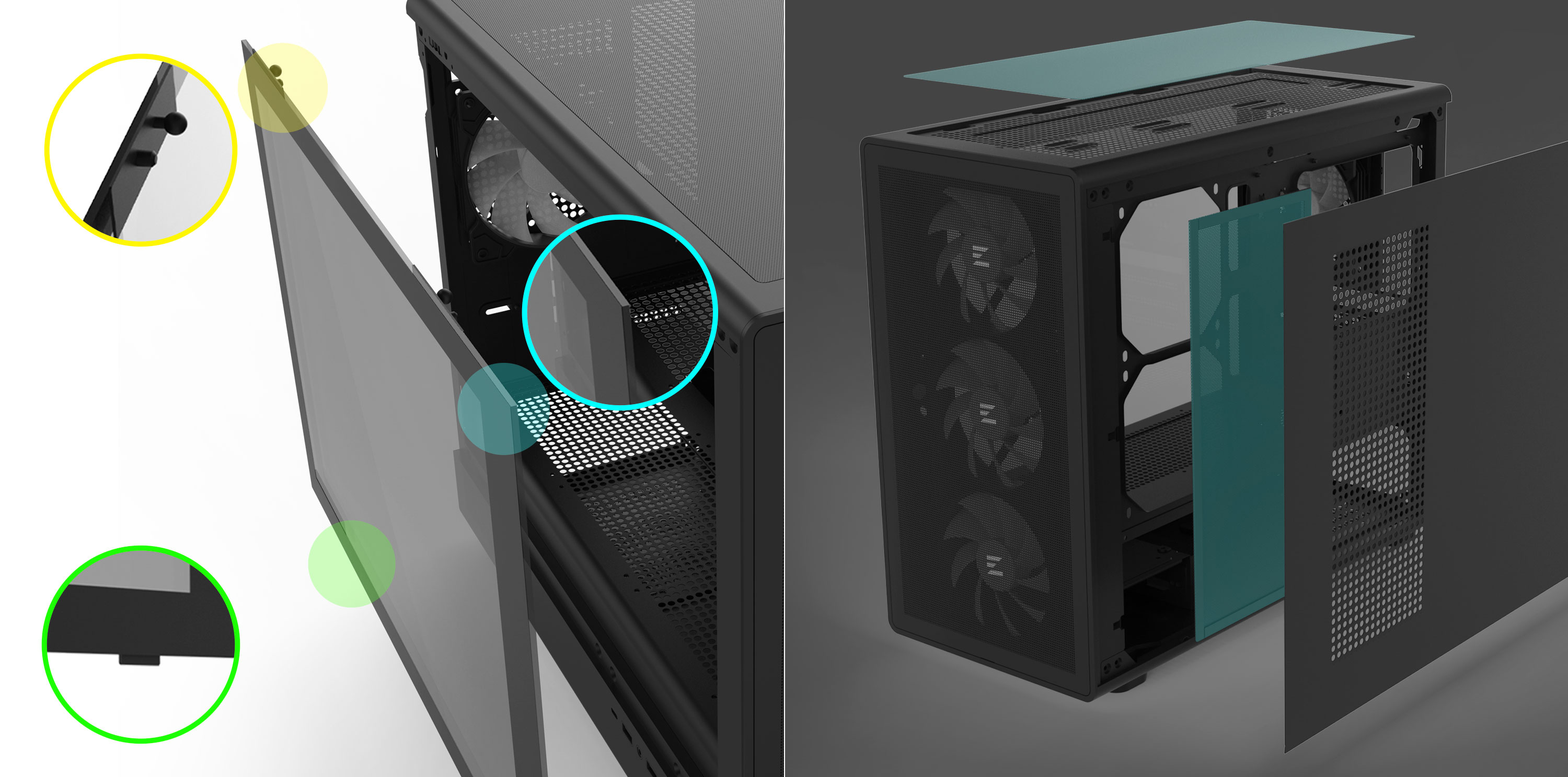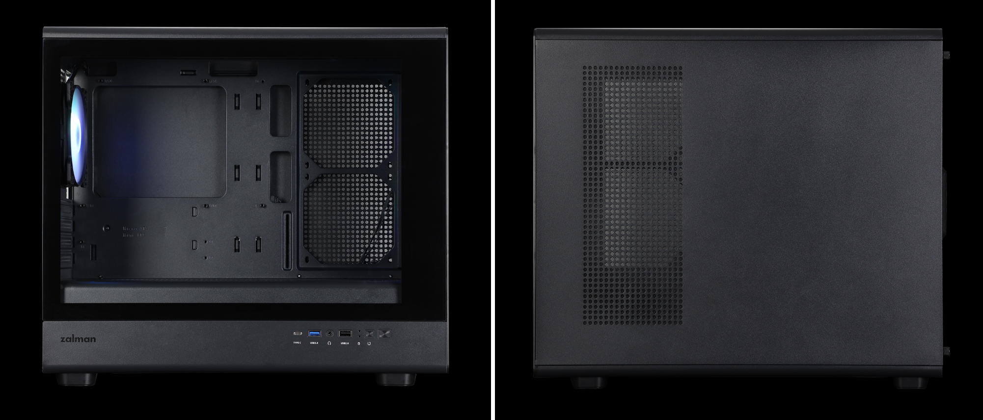 Бічну ліву панель корпусу Zalman М5 із загартованого скла закріплено безґвинтовим способом для зручного доступу до компонентів. Вона підкреслює візуальний ефект інтер’єру корпусу та має стильний вигляд. Передня панель – металева сітка, яка забезпечить активну циркуляцію повітряних потоків. Корпус виготовлено з міцної сталі з чорним покриттям, яке нанесено спеціальним способом. Покриття надійне та досить стійке до можливих механічних пошкоджень, тертя. У корпусі немає гострих або невідшліфованих граней, що важливо у разі самостійного чи промислового складання. Корпус Zalman М5 буде лаконічним доповненням сучасного інтер’єру.