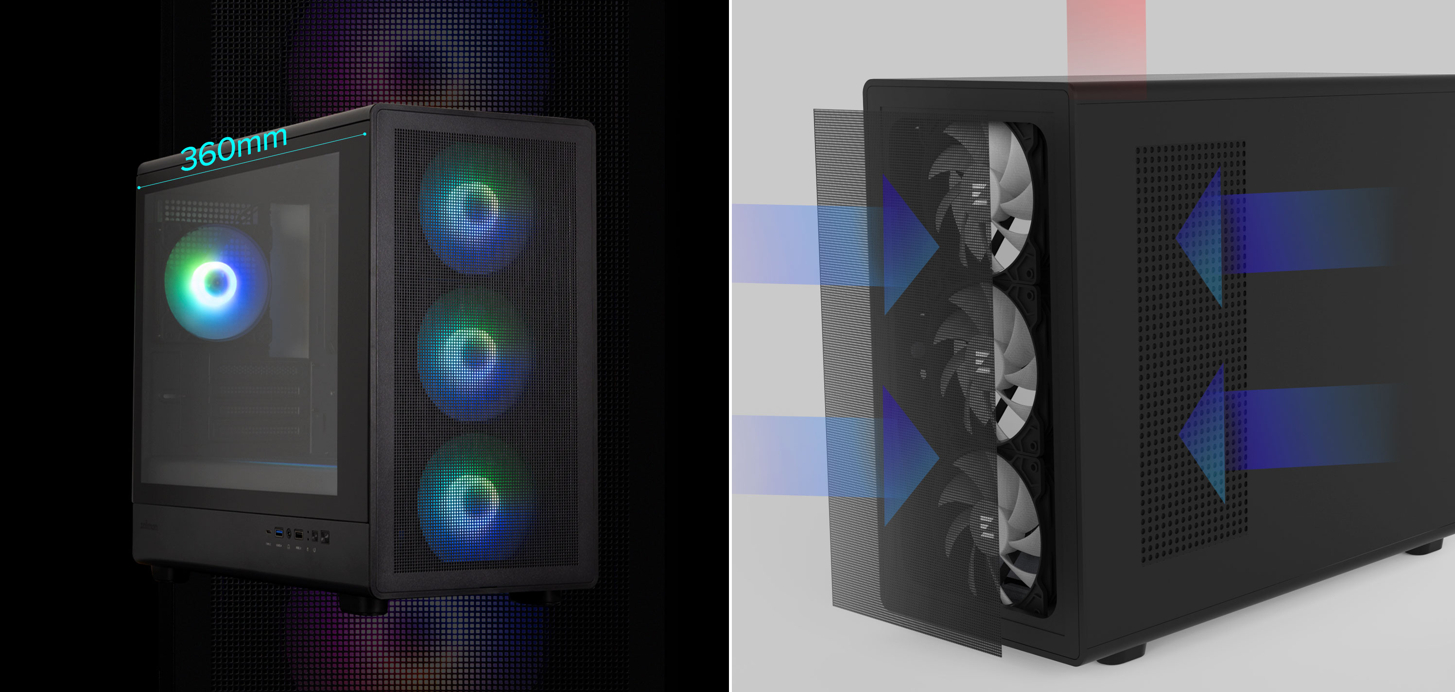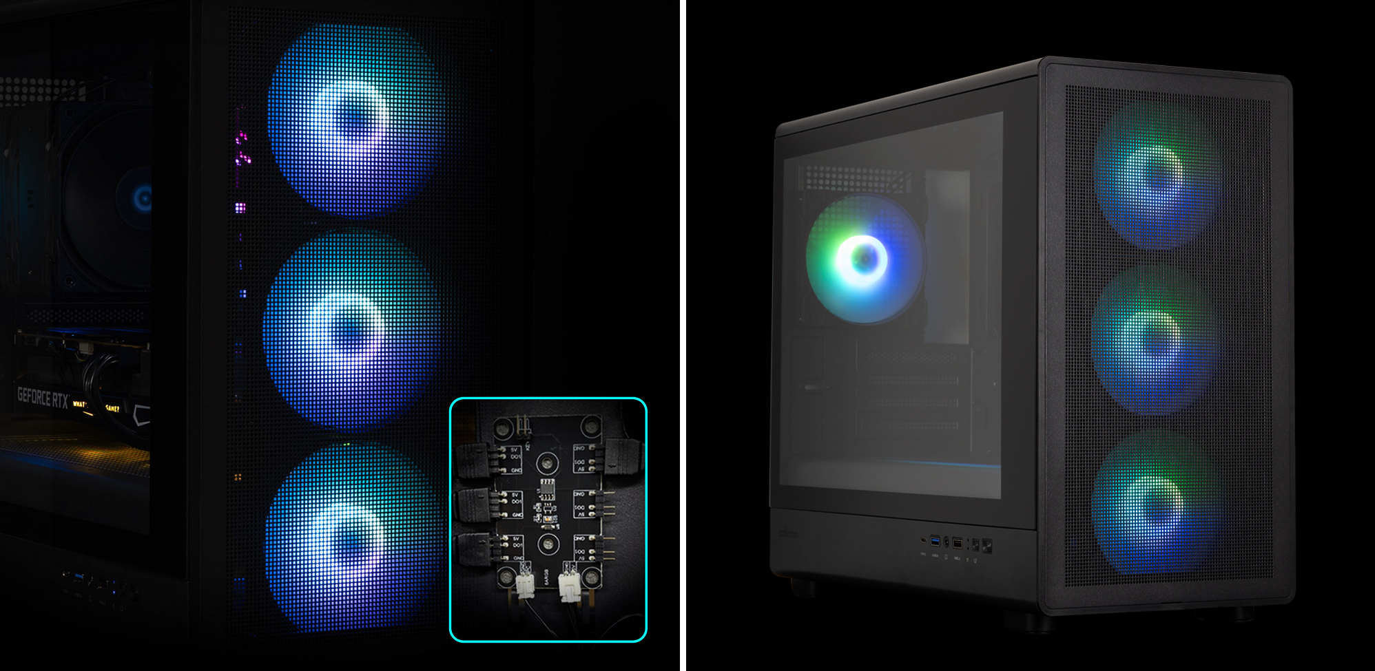 Комплектовання передбачає 3 × 120 мм вентилятори: 2 шт. × 120 мм на передній панелі та 1 шт. × 120 мм на задній панелі. Яскраве ARGB-підсвічування вентиляторів привертає увагу, додаючи візуальної привабливості. Вентилятори підключено до контролера. Завдяки особливостям конструкції забезпечено ефективне обдування внутрішнього простору, а також продумано захист компонентів від пилу.