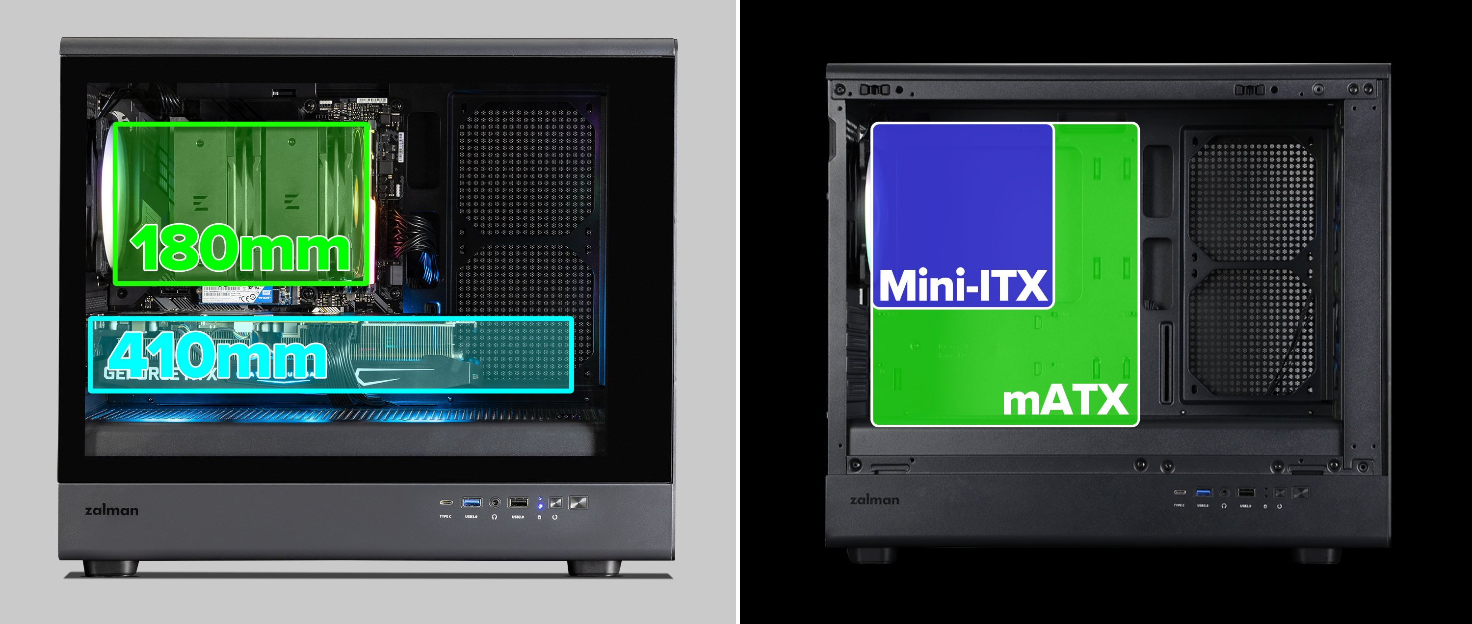 • можливість розміщення блока живлення стандарту ATX завдовжки до 230 мм, охолодження для процесора заввишки до 180 мм, відеоадаптер завдовжки до 410 мм;