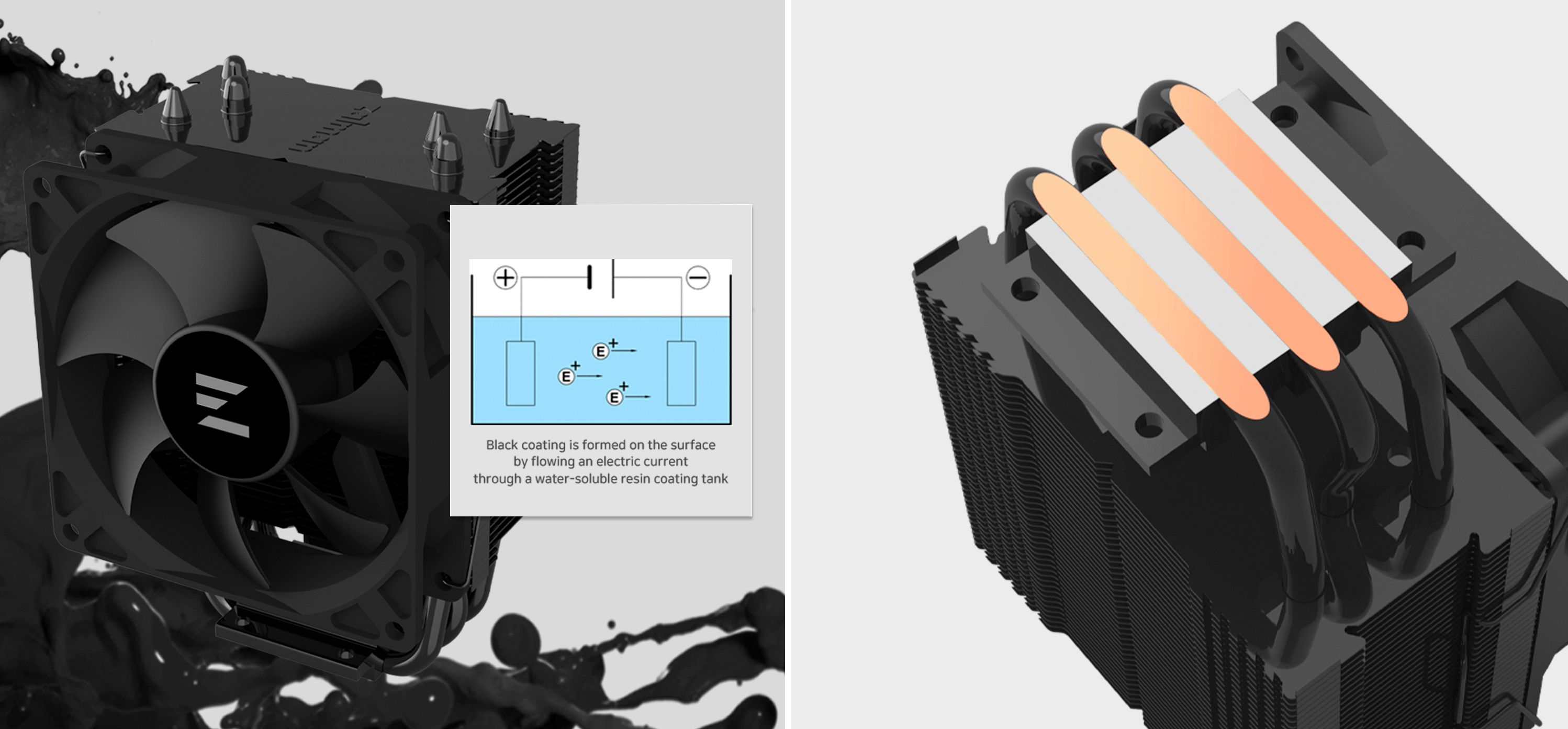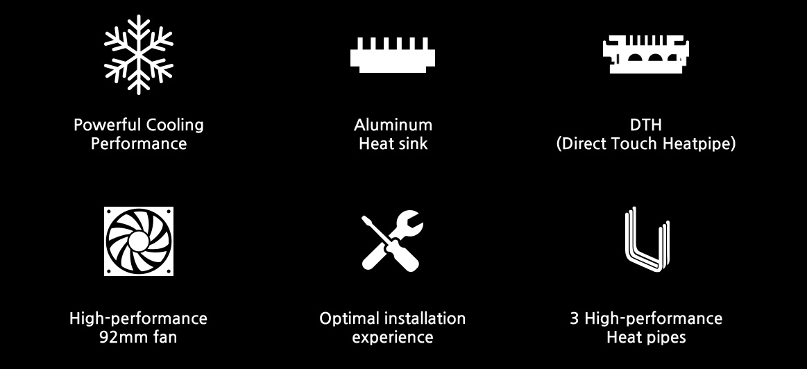 • для охолодження задіяно три мідні теплі трубки з чорним покриттям, розташовані симетрично. Встановлений кулер не створюватиме перешкод для фіксації інших компонентів (оперативної пам’яті з високими радіаторами). Кулер виготовлено з застосуванням технології DTH (технологія прямого контакту) для посилення розсіювання тепла від процесора та підвищення продуктивності охолодження;