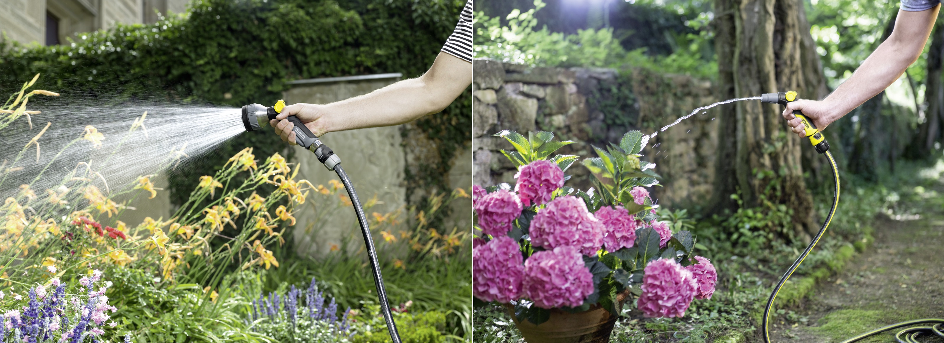 Для ручного поливу Kärcher пропонує пістолети та розбризкувачі з різними режимами подавання води: м’який душ, потужний струмінь, точкове зрошення. Такий підхід дає змогу легко змінювати режим зрошення залежно від типу рослин: молоді саджанці, розсада, газон або клумба. А щоби забезпечити надійне з’єднання між усіма елементами, знадобляться адаптери.