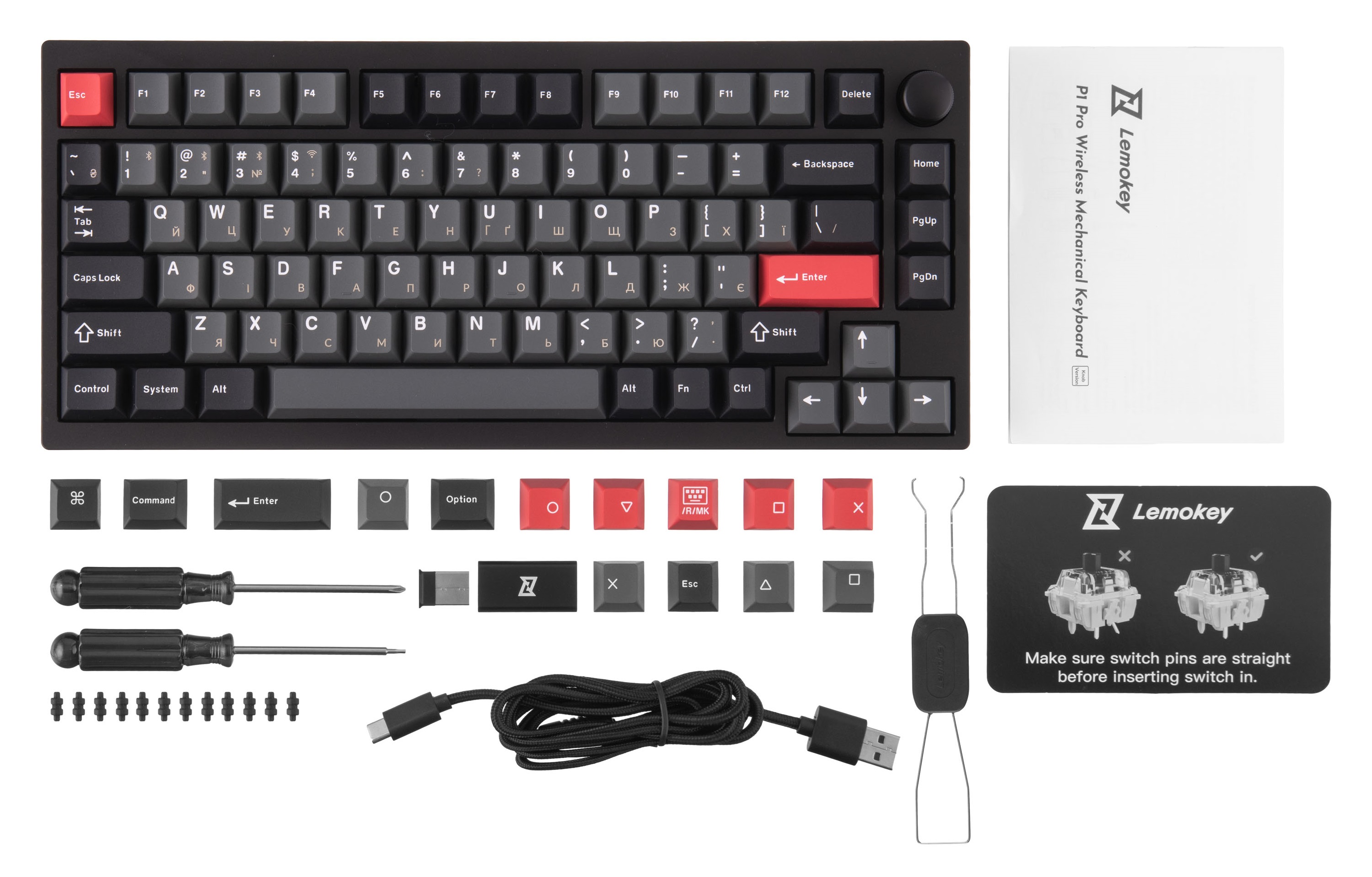Lemokey P1 Pro вражає не лише функціональністю, а й продуманим комплектом постачання. Разом із клавіатурою користувач отримує все необхідне для налаштування під власні потреби. У коробці передбачено додаткові ковпачки клавіш, що дають змогу персоналізувати розкладку та акценти кольору. Наявність інструментів для зняття перемикачів і кейкапів робить процес кастомізації простим і безпечним навіть для новачків. Дві викрутки допоможуть у разі глибшого обслуговування.