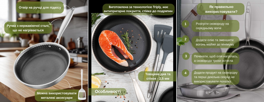 Ці сковороди з нержавіючої сталі виготовлено за технологією Triply, яка поєднує кілька шарів металу для рівномірного нагрівання та стійкості до деформації. Протипригарне покриття відзначається стійкістю до подряпин, тож можна використовувати навіть металеві аксесуари. Сковороди сумісні з усіма типами плит і придатні для миття в посудомийній машині.