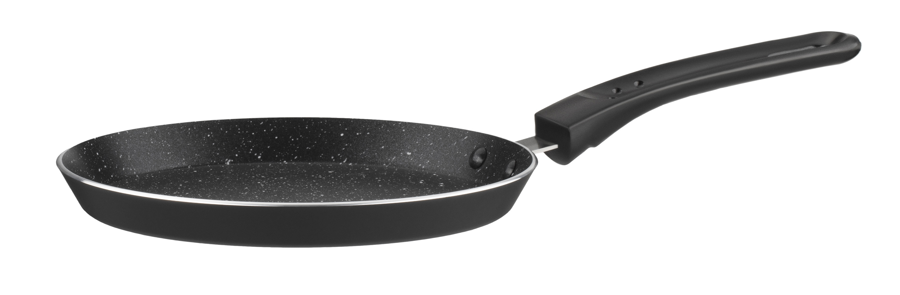 Сковороди чорного кольору виготовлено з алюмінію, вони мають мармурове протипригарне покриття та термостійке бакелітове руків’я. Сумісні з усіма видами плит, включно з індукційними, та придатні для миття в посудомийній машині.