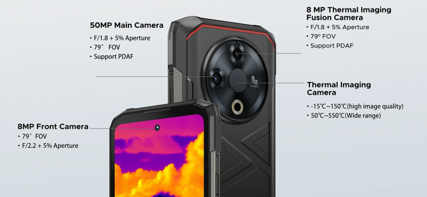 Doogee Fire 6 оснащений 8-мегапіксельним тепловим сенсором (Fusion Camera), що поєднує звичайну та теплову зйомку в одному модулі – справжній мастхев для польових фахівців і туристів.