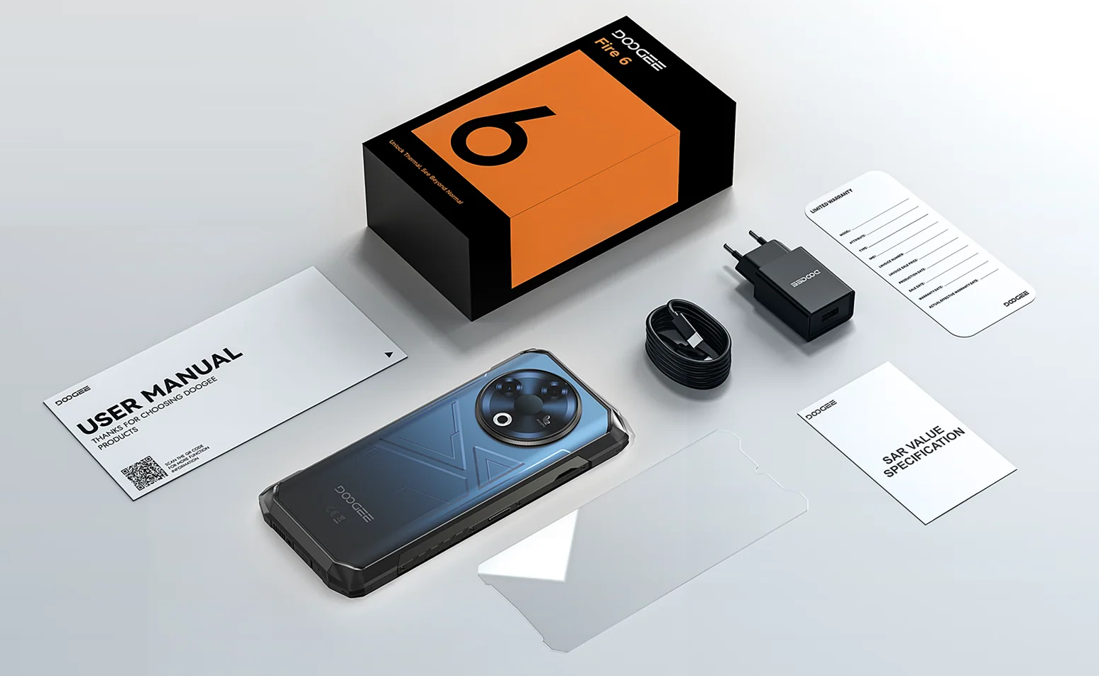 Doogee Fire 6 постачають у стильному чорному пакованні з помаранчевими акцентами, що підкреслює його пригодницький характер. Усередині коробки користувач знайде все необхідне для старту: