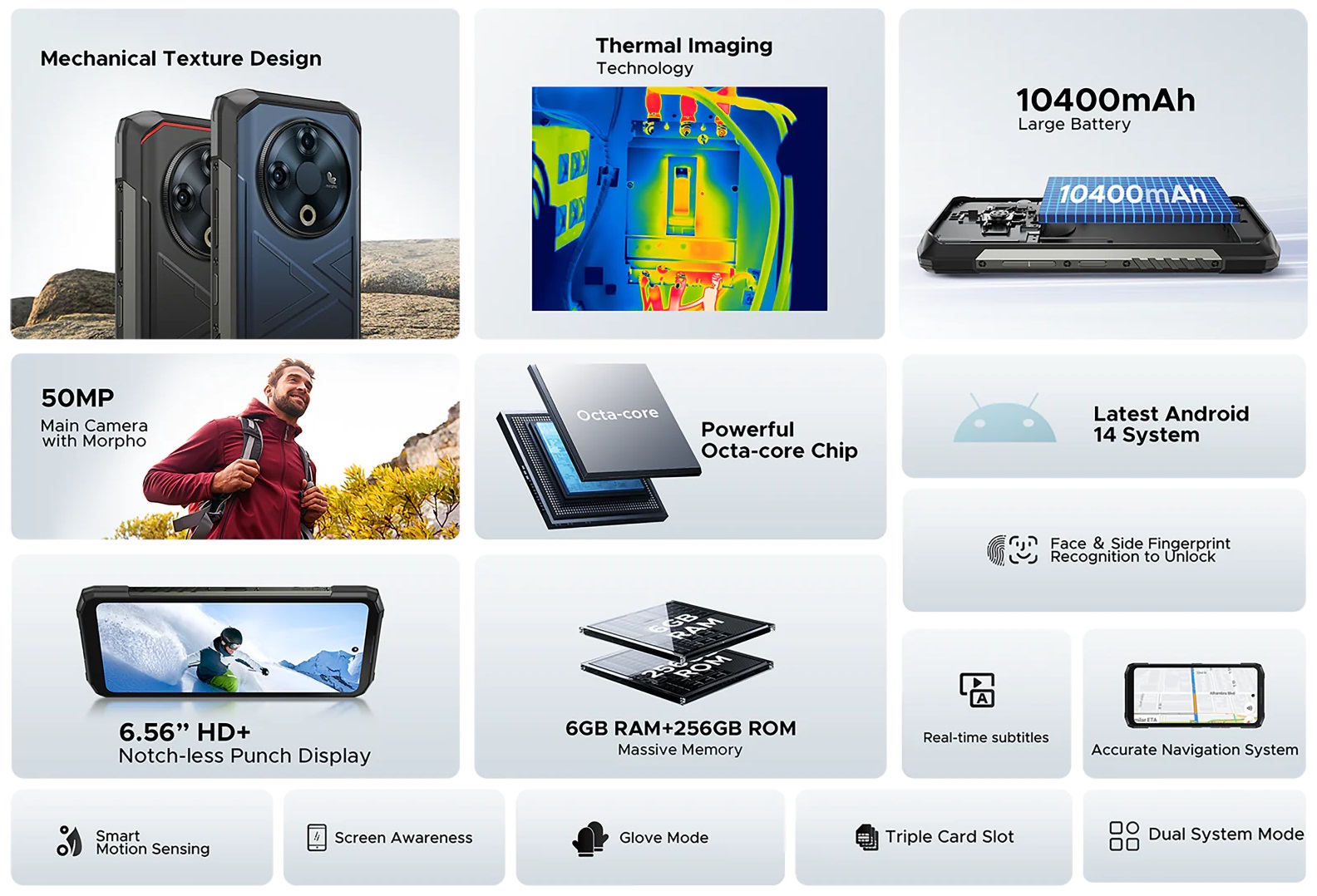 Doogee Fire 6 - наднадійний смартфон зі збільшеним акумулятором на 10400 мА·год для максимальної автономності. Оснащений 6.56-дюймовим 90 Гц HD+ дисплеєм, процесором Unisoc T606, 6/256 ГБ пам’яті та потрійною камерою 50 МП + тепловізор + 8 Мп. Сертифікати IP68/IP69K/MIL-STD-810H забезпечують захист від води, пилу та падінь.