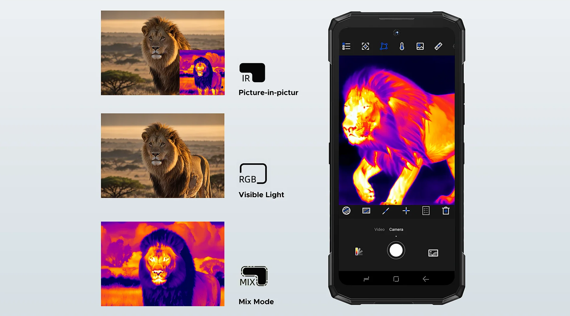 • Кілька режимів: інфрачервоний, мікс (поєднання), Picture-in-picture, звичайна зйомка – надають гнучкості під різні завдання.