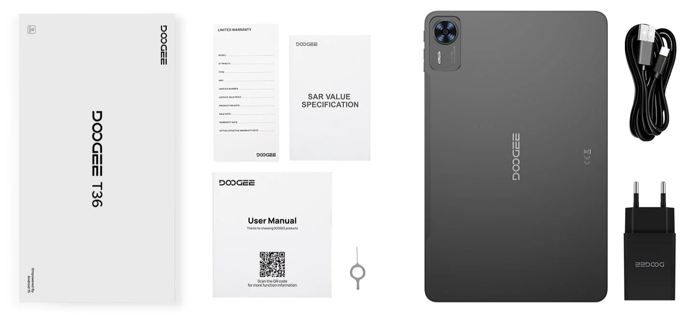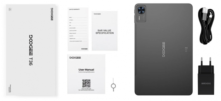 Планшет Doogee T36 постачають у фірмовій коробці з брендовим дизайном. У комплекті є все необхідне для початку роботи: