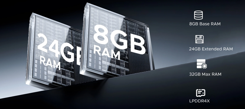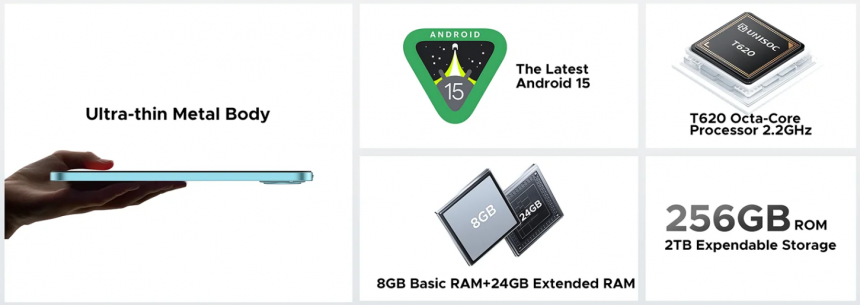 Пам’ять – 8 ГБ ОЗП (без штучних «розширень») і 256 ГБ вбудованого сховища – цього вистачить для офлайн-курсів, відео, великих презентацій і робочих архівів. За потреби обсяг легко масштабувати завдяки T-flash (microSD) до 2 ТБ; гібридний лоток пропонує вибрати між 2×nano-SIM або nano-SIM + microSD.