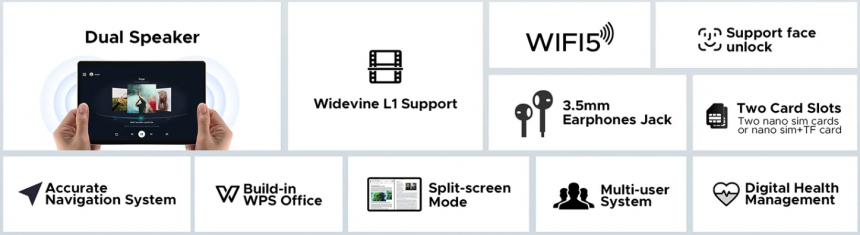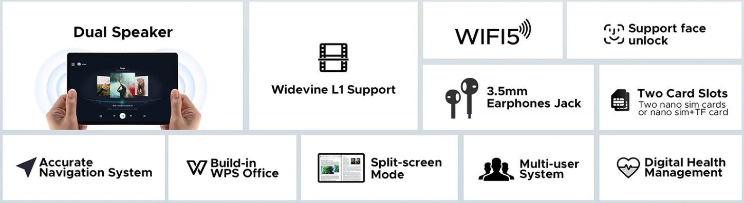 Стереодинаміки планшета гармонійно доповнюють мультимедійний досвід: звук – чистий і об’ємний, а наявність 3,5-мм аудіорозніму згодиться для підключення улюблених навушників для приватного прослуховування або роботи.