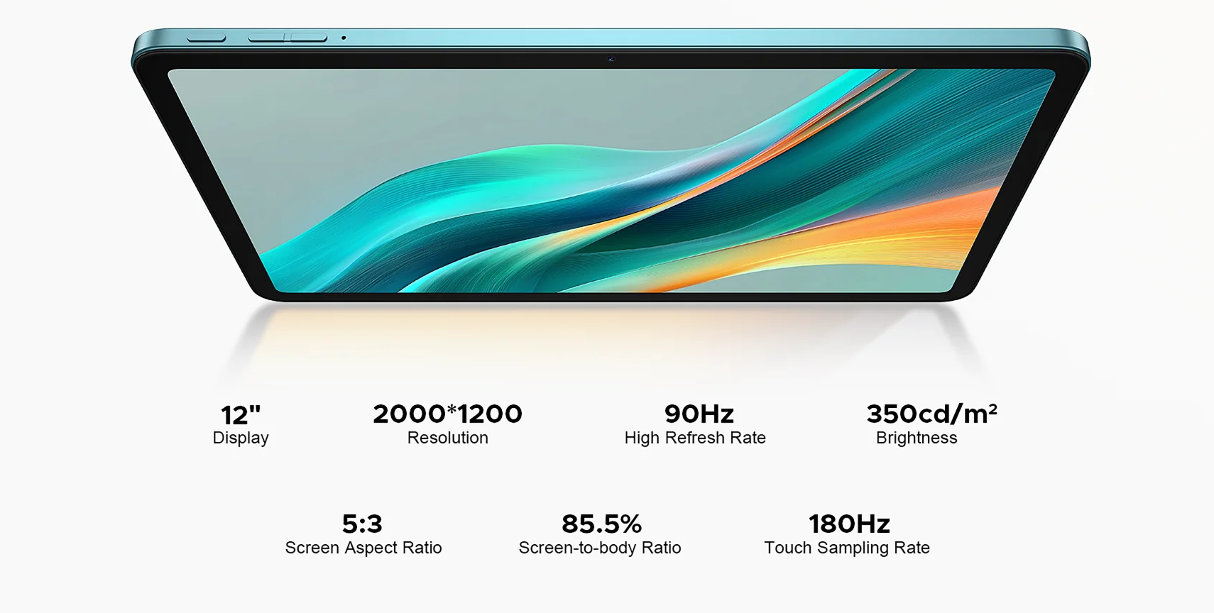 Doogee T36 має 12-дюймовий IPS FHD+ дисплей із роздільною здатністю 2 000 × 1 200 і співвідношенням сторін 5:3. Відношення екран/панель становить близько 85 %, що дає великий робочий простір у компактному корпусі. Витягнута пропорція робить картинку комфортною для перегляду контенту у вертикальному форматі.