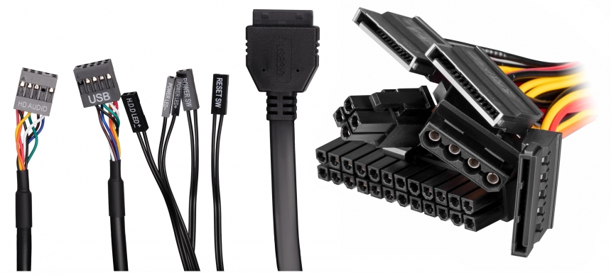У комплекті підключення живлення оптимальний набір кабелів: материнська плата, процесор, три Molex та один SATA для під’єднання периферійних пристроїв. У комплекті є всі необхідні та зручні для використання розніми, кнопки та індикатори: два USB 2.0, HD AUDIO+MIC, Power, Reset, Power LED, HDD LED.