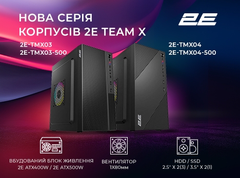 Звертаємо увагу на оновлений асортимент корпусів 2Е серії TeamX – моделі 2E-TMX03-500 та 2E-TMX04-500. Комп’ютерні корпуси виготовлено на основі ідентичного шасі та вони мають аналогічну комплектацію, що і 2E-TMX03 та 2E-TMX04. Вбудовано 500W блок живлення 2E ATX500.